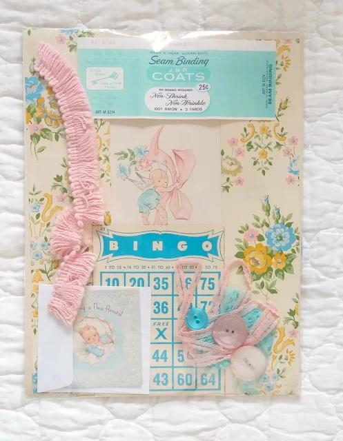 They have things like old wallpaper, bingo cards, laces and buttons, cards, vintage product packaging, playing cards, book pages, ticket stubs, etc.