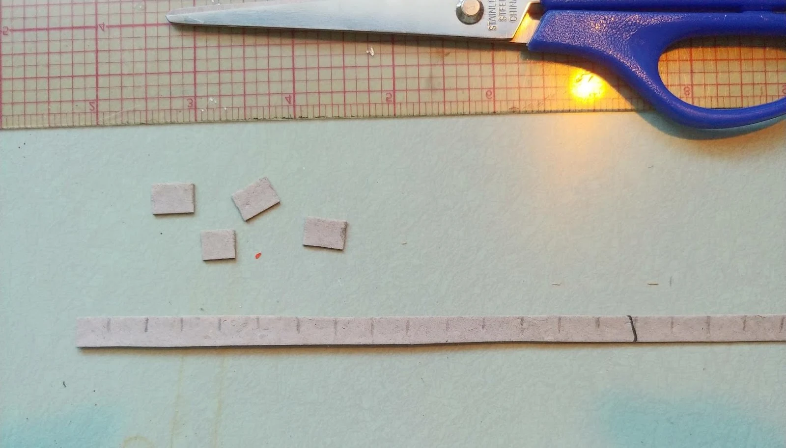 Cut a strip from the egg carton about 1/4" thick and then mark where you'll cut the bricks. I made my bricks in varying widths, 1/4" up to about 1" for those that will wrap around the corners.